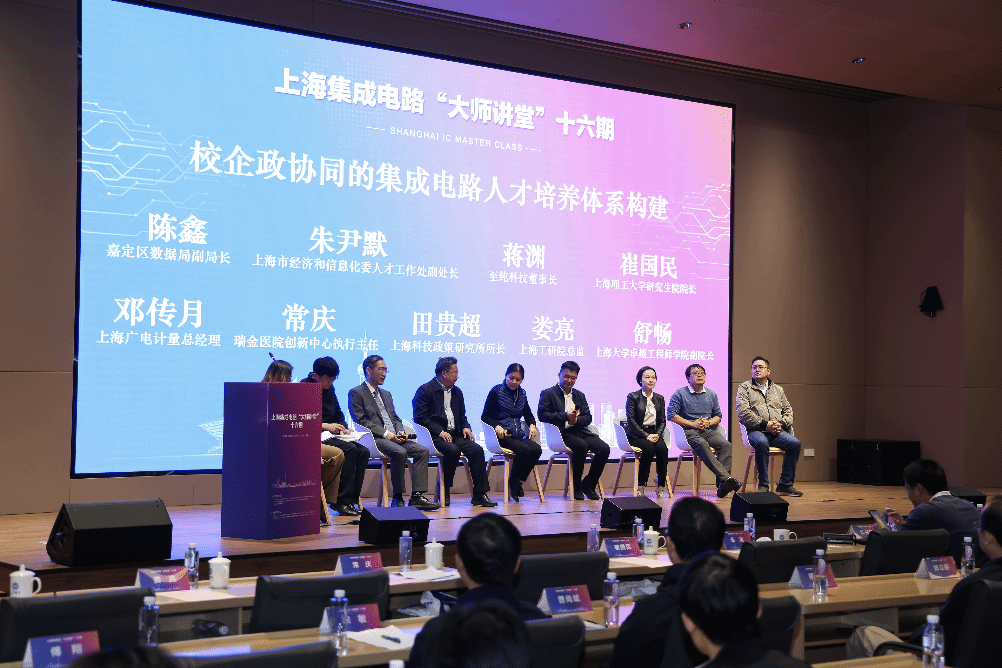 “在围绕‘校企政协同的集成电路人才培养体系构建’主题展开的圆桌论坛上,由嘉定区数据局副局长陈鑫主持,市经信委人才处副处长朱尹默、至纯科技董事长蒋渊、上海理工大学研究生院院长崔国民教授、上海广电计量总经理邓传月、瑞金创新中心执行主任常庆研究员、上海科技政策研究所所长田贵超、上海工研院总监娄亮、上海大学卓越工程师学院副院长舒畅等八位来自政产学研领域的嘉宾,通过多维对话达成共识:需构建‘政府引导、高校育才、企业用才’的协同机制,即高校通过跨学科课程设置夯实培养基础,企业深度参与人才全周期培养,政府则聚焦政策保障与资源精准对接。”