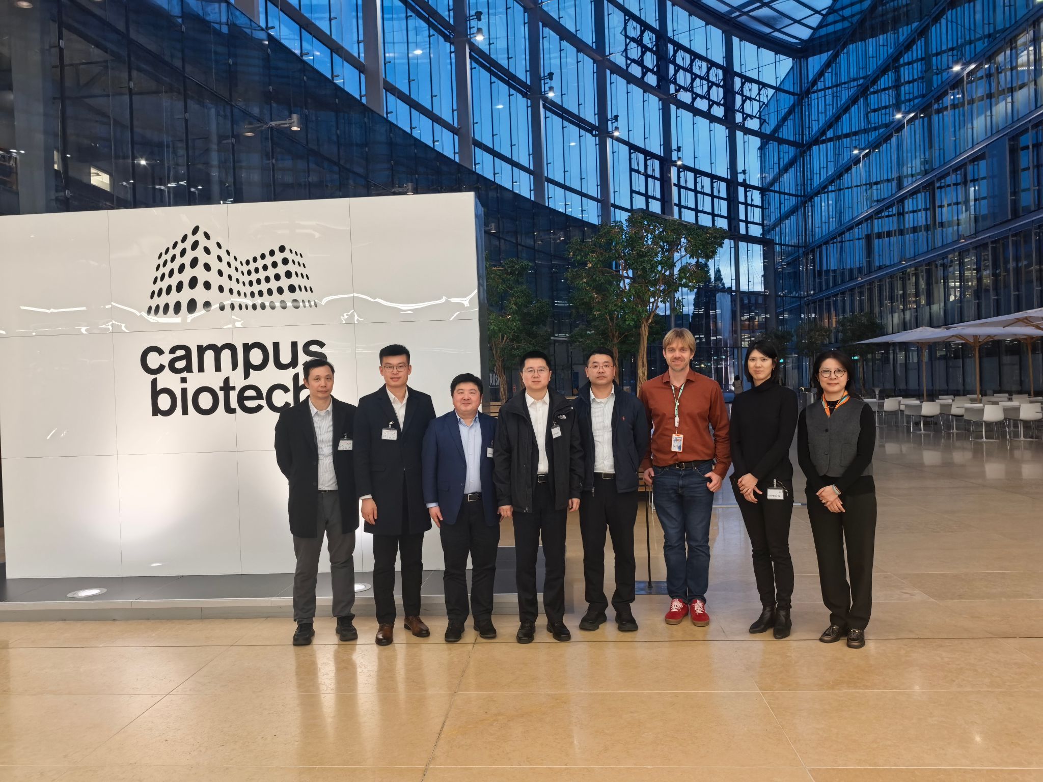 在张磊教授的陪同下,代表团一行还专程前往位于日内瓦的Campus Biotech园区进行参观。该园区由杜比院士等知名科学家参与创建,是瑞士最早且最成功的集产学研用于一体化的生物科技和医疗技术创新园区之一。园区汇聚了洛桑联邦理工大学、日内瓦大学等世界顶尖高校的科研力量,获得了包括Wyss基金会在内的多家知名机构支持,孵育了众多生物技术领域的明星企业。